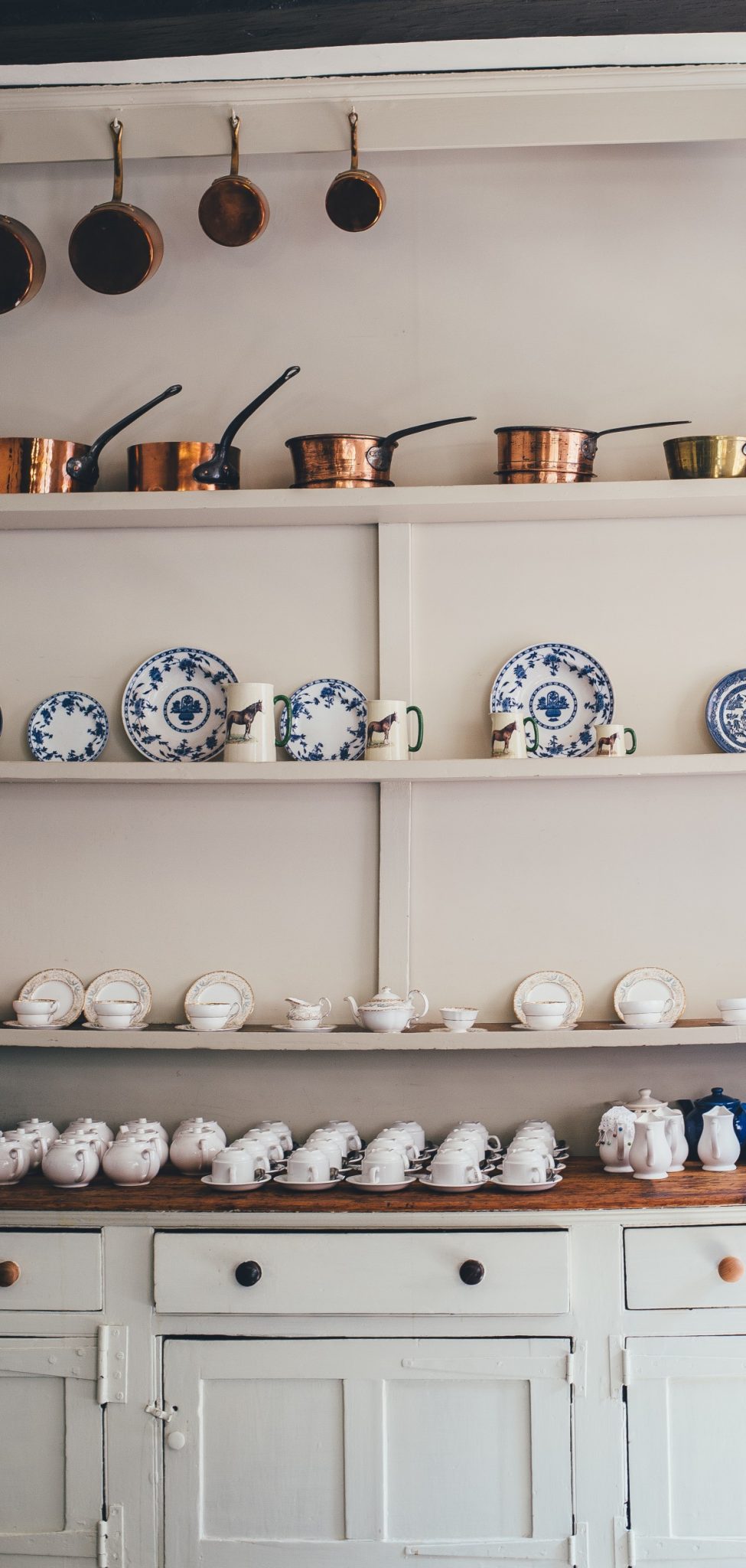 Pensemos, por ejemplo, a una estructura de roble macizo con acabado de pátina blanca con una isla central de estanterías como complemento, y muebles altos realizados quizás con puertas enmarcadas con vidrieras… ¡el sueño de cualquier amante del género shabby!