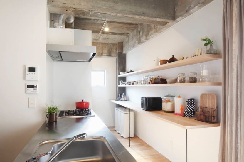 Cuando se piensa en una cocina estrecha y alargada, optar por muebles altos con puertas o cajones puede resultar problemático de gestionar. Para ello es posible confiar a la conveniencia de los estantes. No tengas miedo de tener todas tus cosas a la vista, pero confía en tu creatividad creando unidades de pared abiertas donde puedas albergar los característicos especieros que también pueden resultar agradables a la vista.