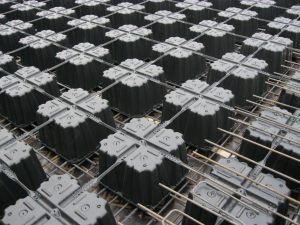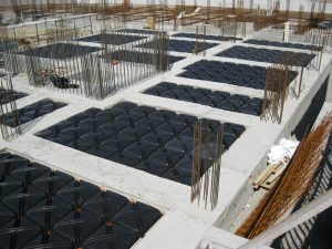 Estos suelen tener una lengüeta y ranura. Encima se coloca una malla electrosoldada y se realiza un colado de terminación de hormigón, que entra en los bordillos, entre las patas de los iglús y encima de ellos forma una capa de unos 4-5 cm de altura.